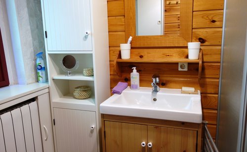 Badkamer: Wastafel, douche, wc.