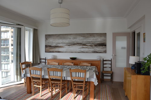 Grote woon-eetkamer met smalle terras, volledig uitgeruste keuken met 2 koelkasten.