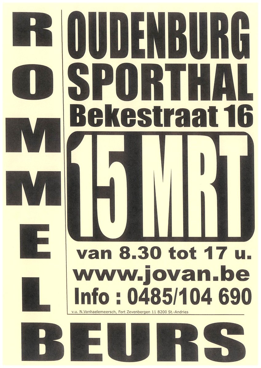 Rommelbeurs Org. Jovan – Sporthal Ter Beke Oudenburg – Bekestraat 16 – 8460 Oudenburg – zondag 15-03-2026 – van 8.30 u tot 17.00 u – inkom : 2,00 Eur – standgeld : 4,50 Eur per lopende meter rijstand - de sporthal van Oudenburg ligt in het centrum – Oudenburg ligt 10 km van Oostende – info : Org. Jovan www.jovan.be - - – 050/382883