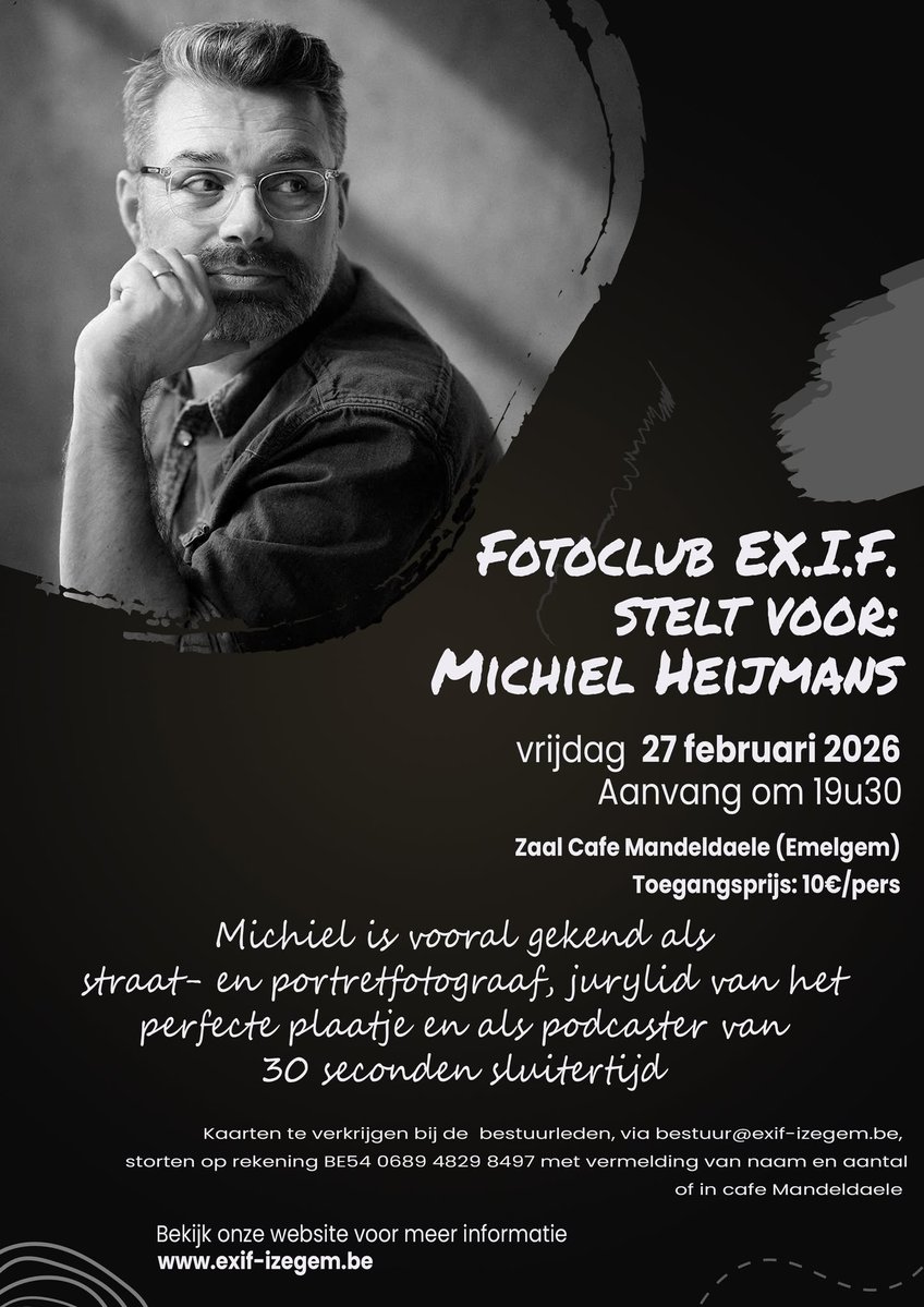Op uitnodiging van de Izegemse fotoclub Exif komt Michiel Heijmans zijn manier van fotograferen uitleggen.
