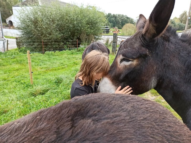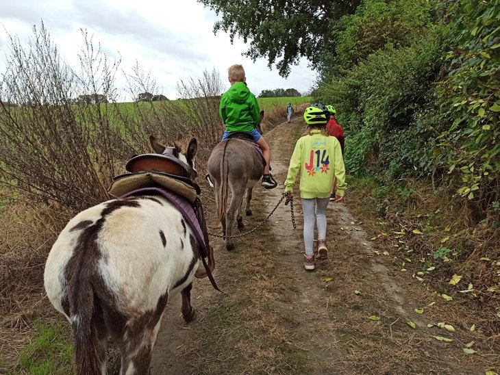 In de geest van wat we tijdens stages en verjaardagen organiseren, maken we eerst kennis met de ezels in hun weiland. Je zult ze allemaal kunnen ontmoeten en degene kiezen die je wilt voor de rit. (+/- 30 minuten) Je leert ze een halster omdoen en ze voorbereiden (borstelen, op het zadel zetten) voor de rit, die ongeveer 1 uur en 15 minuten zal duren. Terug op de boerderij moet je de ezels zadelen en terug in de wei zetten (+/- 15 min) De hele activiteit duurt ongeveer 2 uur In praktijk : - Ontvangst in de molen van Gentinnes; rue du Moulin, 183 Gentinnes (Chastre) - 80 (2 ouders + kinderen) 10 per extra volwassene - Duur van de activiteit: ongeveer 2 uur - Om geschikte schoenen en fietshelm te zien (maar je kunt ze ook dragen ? ) - Op afspraak volgens onze mogelijkheden.