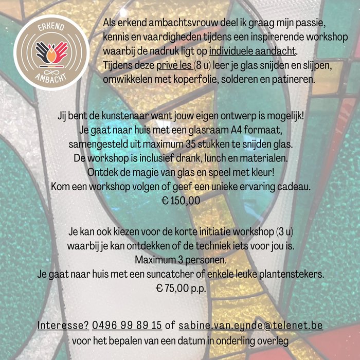 Tijdens een intensieve workshop (hele dag/€ 150) maak je onder begeleiding een glasraam A4 formaat dat je 's avonds volledig afgewerkt meeneemt naar huis. Je mag een eigen ontwerp uitvoeren. Vooraf bespreken ontwerp is noodzakelijk (haalbaarheid).