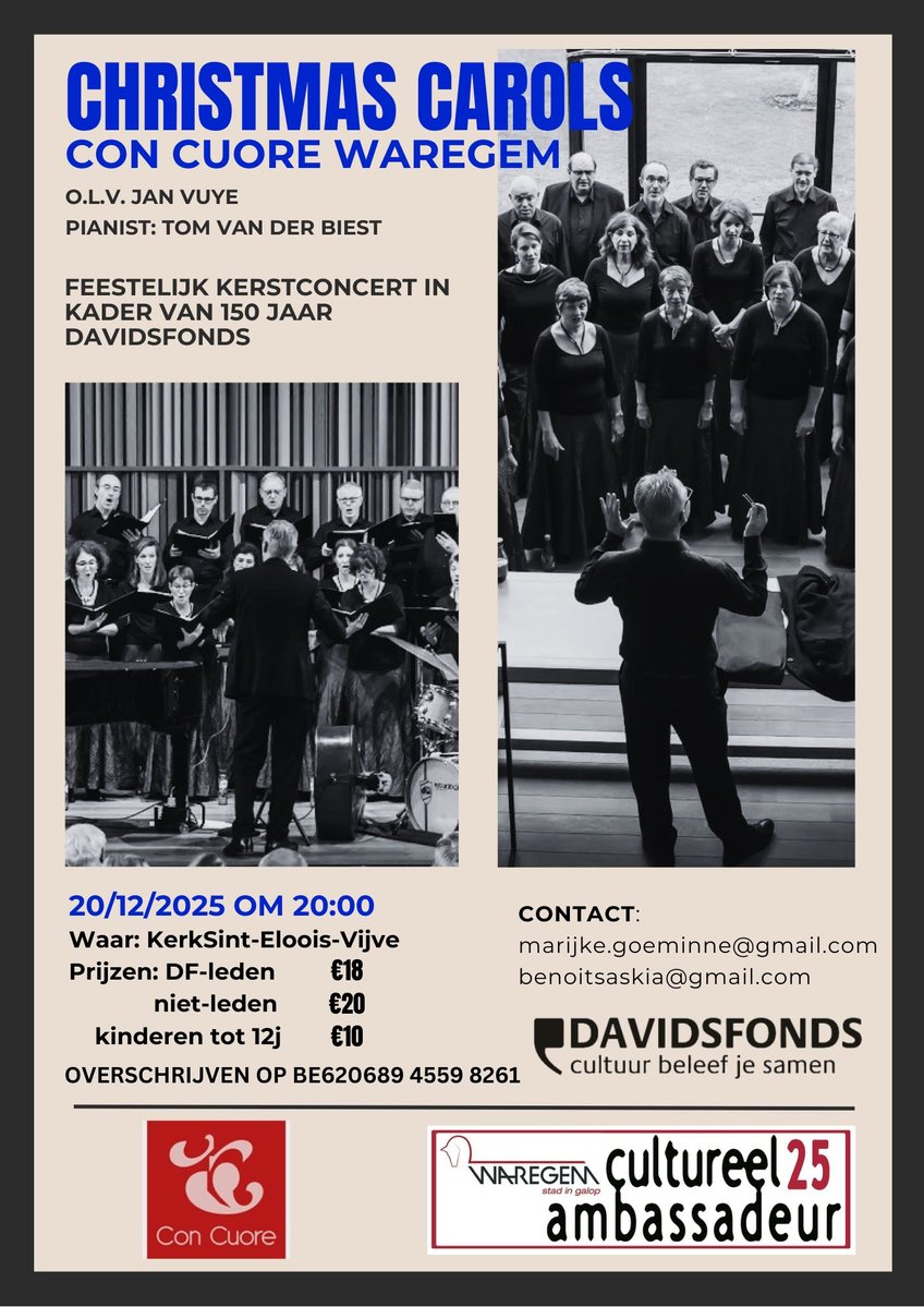 Christmas Carols door Con Cuore, vermaard zangkoor uit Waregem. Laat je meeslepen door prachtige kerstliederen, sprankelende koorklanken en de echte magie van deze tijd van het jaar. Het wordt een avond die je niet wilt missen !