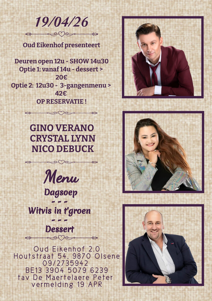 Diner met live optreden van Gino Verano, Nico Debuck & Crystal Lynn