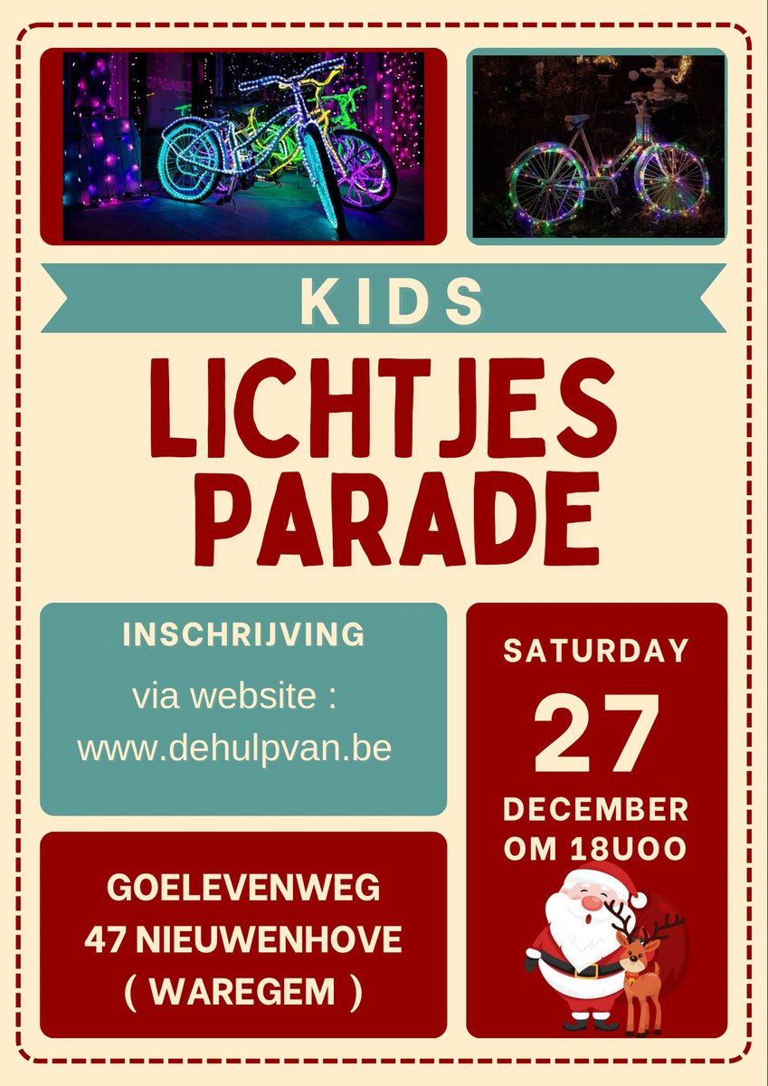 Om 18u00 start de Kids Lichtjesparade, een betoverende stoet waarin kinderen met hun lichtjes op hun fiets, cokart, traptractor enz. in stoet richting de kerstman en zijn elfjes gaan. Deelname hiervoor is gratis, maar we vragen om op voorhand in te schrijven via de website www.dehulpvan.be.
