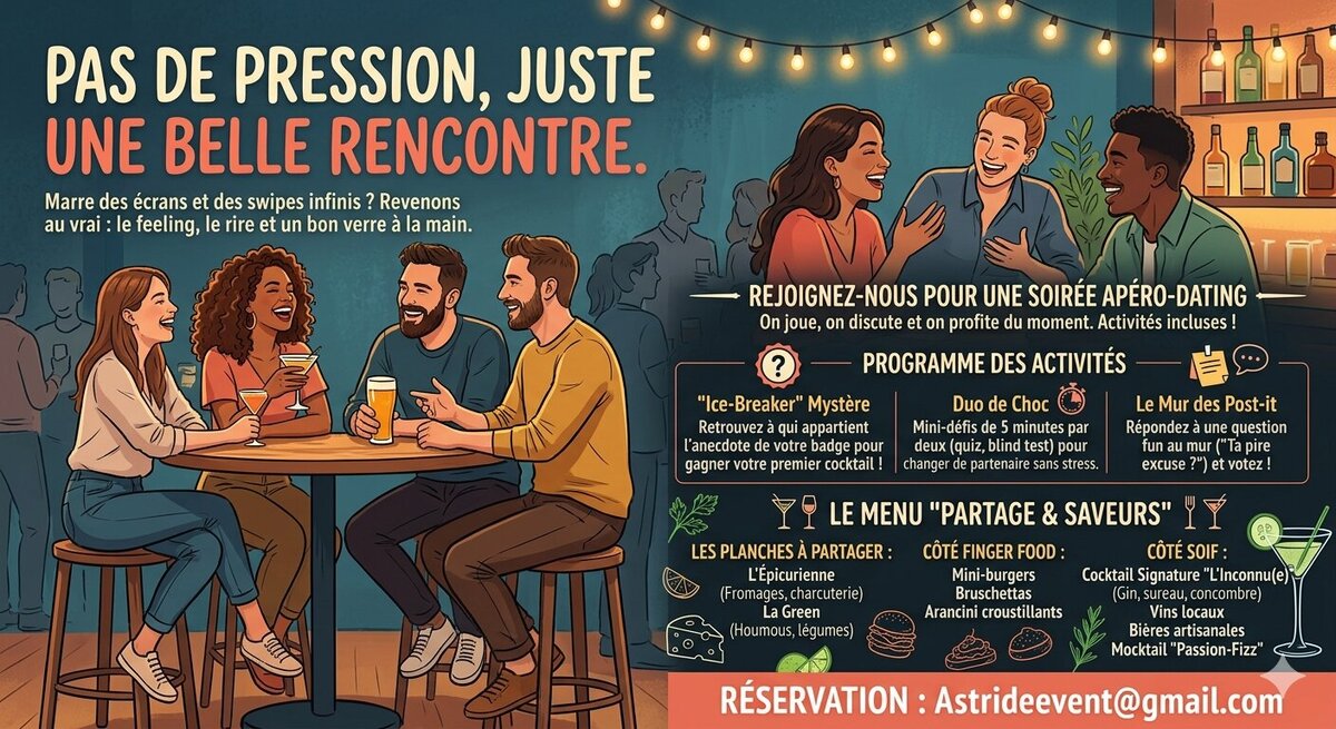 Kom naar onze Apéro-Dating avond, waar we romantische 'sollicitatiegesprekken' achterwege laten. Hier spelen we, praten we en genieten we van het moment. Of je nu verlegen bent of de sfeermaker van de groep, onze activiteiten helpen je om het ijs te breken!