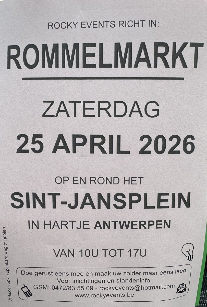 Grote openlucht Rommelmarkt op het Sint jansplein in Antwerpen van 10 u tot 17 u voor een hele dag rommelplezier eet en drankgelegenheid aanwezig en dit op zaterdag 25 april inlichten en standeninfo : of