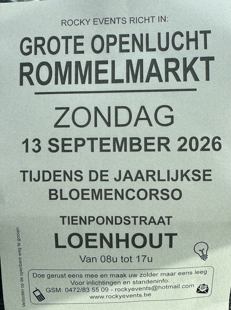 Grote openlucht Rommelmarkt tijdens de jaarlijkse bloemencorso in Loenhout met tal van randanimatie een prachtige bloemencorso en een leuke rommelmarkt eet en drankstandjes, foodtrucks kortom een leuke dag voor het hele gezin inlichtingen en standeninfo: of
