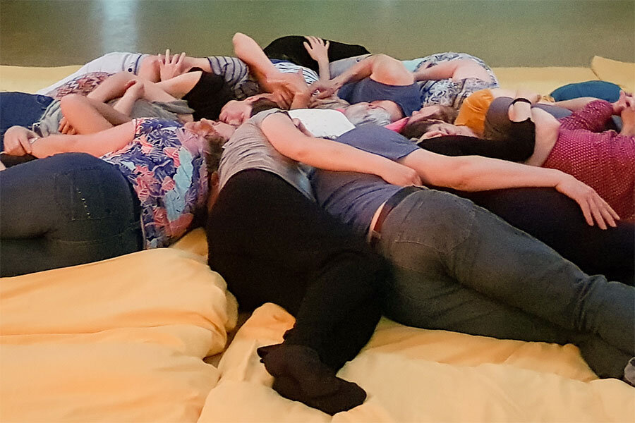 Later op de avond vormen we een knuffelnest. Dit is een groep mensen, die je kan vergelijken met een hoopje zachte, warme puppy’s. Je kan bij zachte muziek dicht tegen elkaar liggen, je eigen plekje zoeken en genieten van elkaars nabijheid.