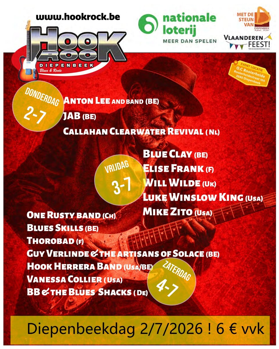 Een absolute topeditie van dit festival met internationale topmuzikanten. Een evenement zonder poespas in een gezellige festivaltent, met zitruimte, catering, een fris drankje, maar bovenal een programmatie die bouwt op vakmanschap en bezieling van de artiesten. Muziek zit in het Dna van de Hookrock organisatie !