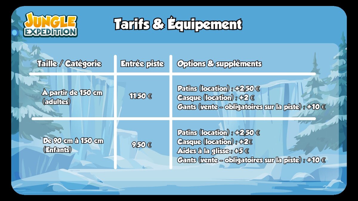 Kinderen (90 cm -> 150 cm) € 9,50 • Volwassenen (+150 cm) € 11,50 • Schaatsen (huur) € 2,50 • Glijhulpmiddelen (huur) € 5 • Helm € 2 • Handschoenen € 10 • Kluisje (huur) € 3