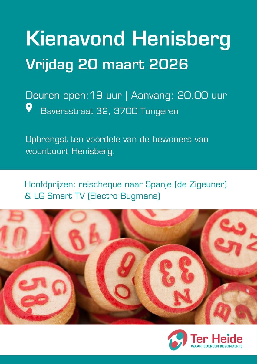 De kienavond van Ter Heide Tongeren keert terug ! Geniet van een gezellige avond in goed gezelschap en steun de bewoners van woonbuurt Henisberg. Iedereen is vanaf 19.00 uur van harte welkom in de sportzaal van campus Tongeren. We beginnen eraan om 20 uur. Inschrijven voor de kienavond is niet nodig.