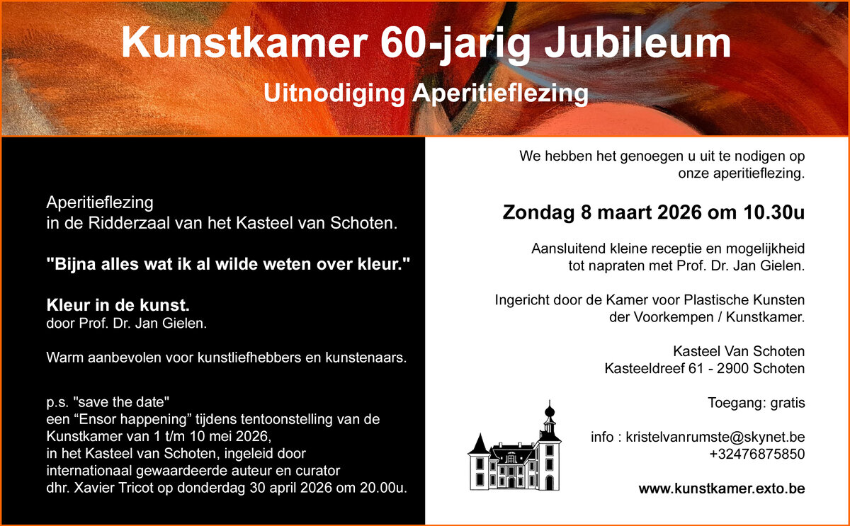 We hebben het genoegen u uit te nodigen op onze aperitieflezing, in de Ridderzaal van het Kasteel van Schoten. op zondag 6 maart 2026 om 10.30u