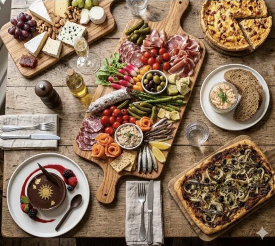 We gaan jullie laten genieten van overheerlijke Franse specialiteiten beginnend met een plankje van vleeswaren, groenten, vis, … met een Franse bubbel.