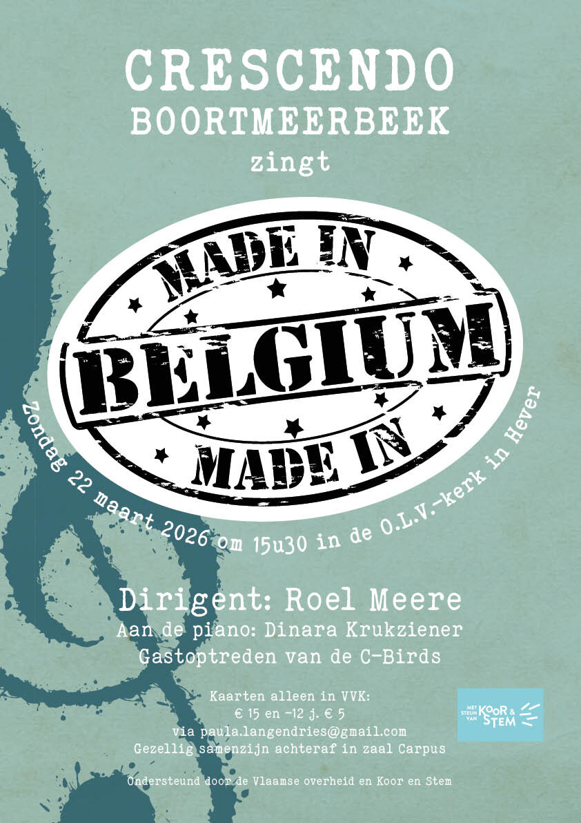 Met Made in Belgium kiest Crescendo resoluut voor repertoire met Belgische roots. Het publiek mag zich verwachten aan een muzikale reis doorheen verschillende stijlen en generaties. Van polyfone parels als Als ick u vinde tot hedendaagse klassiekers als Irene van De Mens: het concert belooft een herkenbare en tegelijk verrassende avond te worden. Ook internationale nummers krijgen een Belgische toets. Zo staat onder meer Sanomi van Urban Trad op het programma, net als sfeervolle arrangementen van populaire liederen die in ons collectief geheugen gegrift staan.
