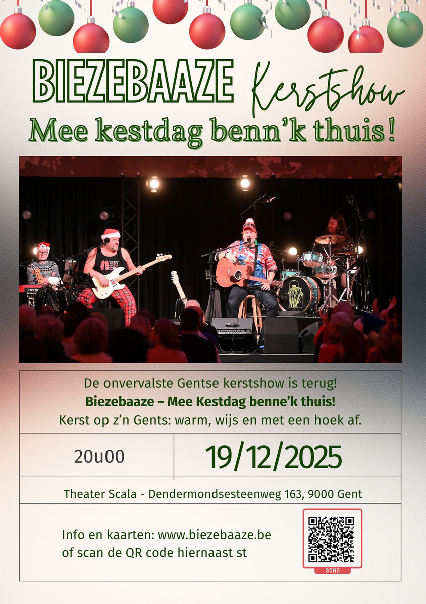 Na het succes van 8 uitverkochte voorstellingen én een volledige uitzending op Avs in 2024, is Biezebaaze dit jaar terug met een logisch vervolg: de onvervalste Gentse kerstshow "Mee Kestdag benne’k thuis !"