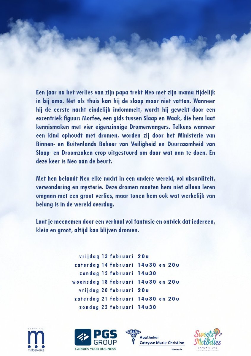 Na het verlies van zijn papa neemt Neo met zijn mama intrek in het verafgelegen huis van oma. Het huis voelt vreemd en stil, maar in de eerste nacht wordt hij gewekt door een excentriek figuur: Morfee, een gids tussen Slaap en Waak, die hem laat kennismaken met vier eigenzinnige Dromenvangers. Telkens wanneer een kind ophoudt met dromen, worden zij uitgestuurd door het Ministerie van Binnen- en Buitenlands Beheer van Veiligheid en Duurzaamheid van Slaap- en Droomzaken. En deze keer is Neo aan de beurt. Met hen belandt Neo elke nacht in een andere wereld, vol absurditeit, verwondering en mysterie. Deze dromen moeten hem niet alleen leren omgaan met groot verlies, maar tonen hem ook wat werkelijk van belang is in de wereld overdag. De voorstellingen/' target='_blank' class='externalbrowser'>voorstelling laat de kracht van dromen en verbeelding zien en herinnert ons eraan hoe belangrijk het is het kind in onszelf te blijven koesteren.