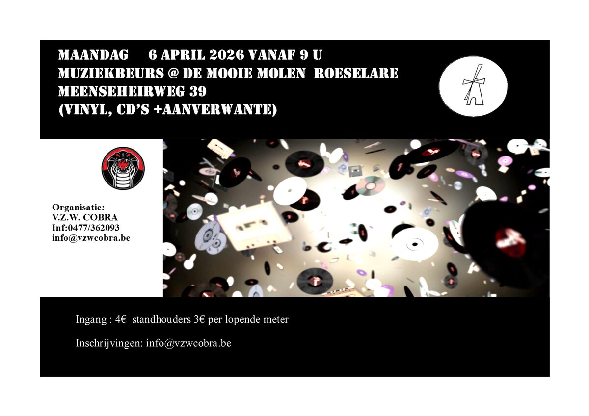 Op Paasmaandag richt vzw cobra, terug zijn jaarlijkse muziekbeurs in in zaal moie molen te roeselare.Dit is een beurs gaande van vinyls, cd's, tot alles i.v;m. muziek Iedreen is terug welkom vanaf 9 u. Ingang is 4 €, en voor de standhouders bedraagt het 3 € perlopende meter. Standhouders dienen vooraf in teschrijven.Inschr. + info: of tel