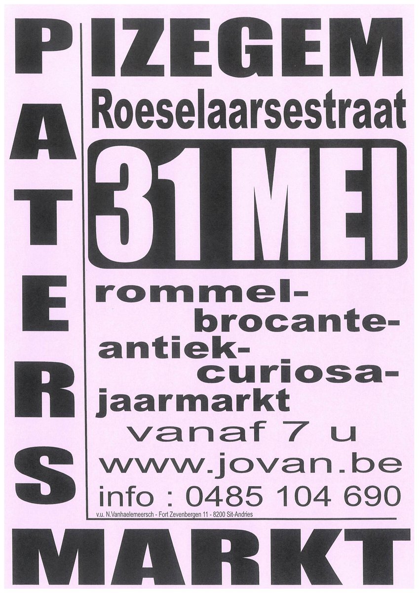 38ste Patersmarkt Org. Jovan : antiek-, curiosa-, brocante-, rommel- en jaarmarkt in de Roeselaarsestraat te 8870 Izegem – zondag 31 mei 2026 - van 7.00 u tot 17.00 u – inkom gratis – 25,00 Eur (tweedehands) & 40,00 Eur (nieuwe goederen) per 10 lopende meter met auto op de standplaats - reservatie verplicht – 300 standplaatsen – info : Org. Jovan www.jovan.be - - – 050/382883