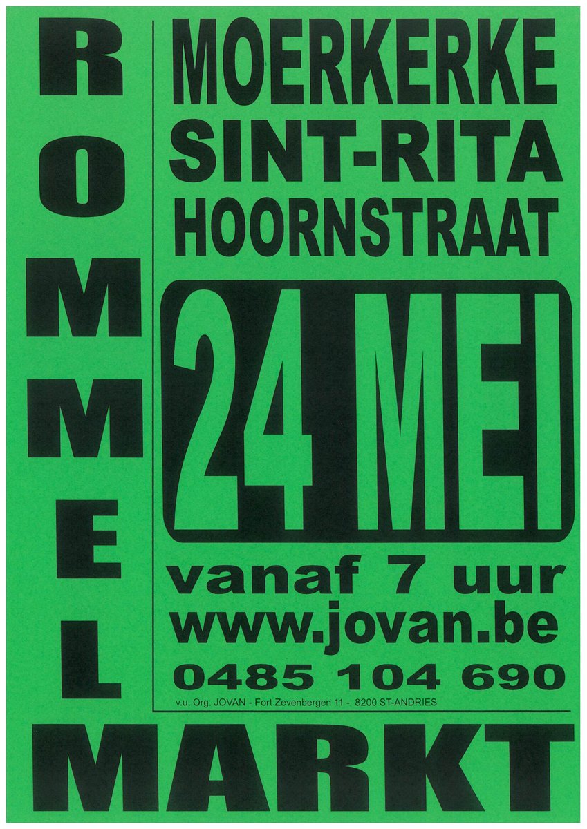 Rommelmarkt Org. Jovan – Hoornstraat – 8340 Moerkerke Sint-rita t.g.v. de kermis – zondag 24-05-2026 - groter parcours : tussen Schoeperstraat en de Kerk – standnummer vanaf 6 u aan huisnr 65 – van 7.00 u tot 17.00 u – inkom gratis – 2,00 Eur per lopende meter – reservatie verplicht – 150 standplaatsen – bij reservatie van 6 m = gratis plaats erbij voor wagen – info : Org. Jovan www.jovan.be - - – 050/382883