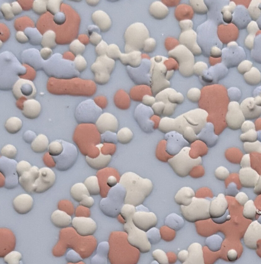 Het werk van Stefanie Vermeire ontstaat vanuit een aandachtig en traag proces waarin wisselende materialen zoals klei, hars, porselein, epoxy nadrukkelijk aanwezig zijn maar vooral de kracht van het aantal door herhaling centraal staat. Niet als iets mechanisch en repetitief maar als organische structuren die zich laag na laag opbouwen, alsof ze gegroeid zijn in plaats van gemaakt. Elk element draagt sporen van een handeling en heeft de bedrieglijke schijn van toeval.