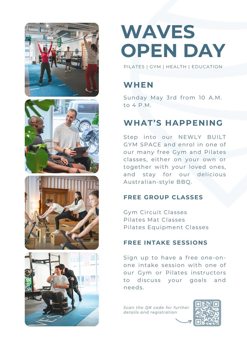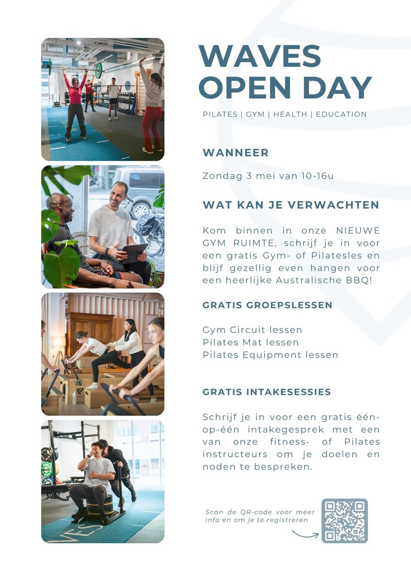 Kom op 3 mei tussen 10 en 16 uur naar onze opendeur voor een dag vol Pilates en gym, met hapjes, drankjes en een flinke dosis plezier ! Noteer deze dag zeker in je agenda en nodig je vrienden en kinderen.php' target='_blank' class='externalbrowser'>familie uit voor een fijne dag bij Waves.