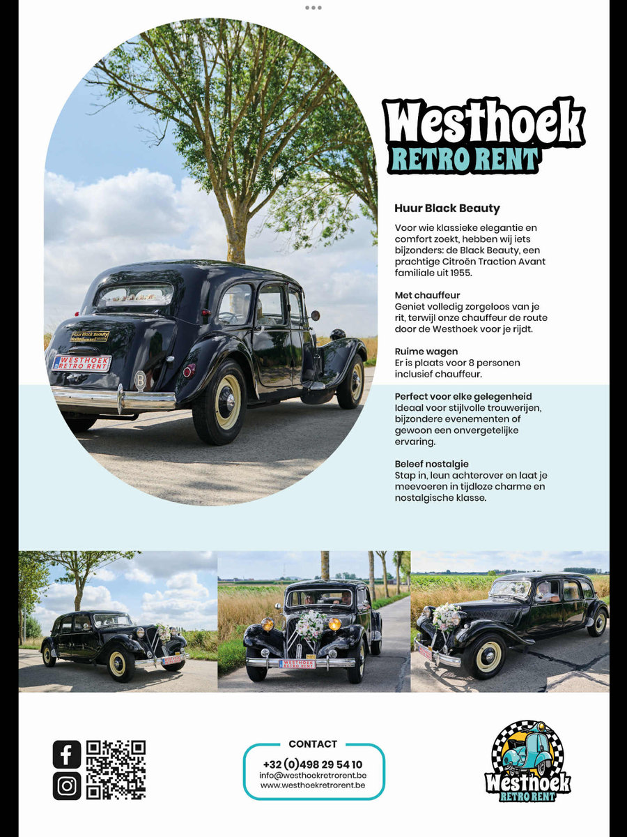 Verhuur oltimer met chauffeur: citroen traction avant familiale tot 8 personen, voor ceremonie, westhoek city tours.