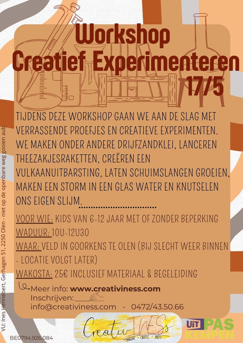 Een speelse mix van wetenschap, creativiteit en verwondering waarbij kinderen zelf mogen proberen, ontdekken en experimenteren ! Verwacht veel verwondering, gelach en creatieve chaos ! Gebaseerd op het boek 'colafonteinen en spetterende verfbommen'.