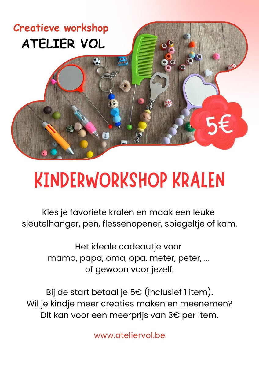 Tijdens deze leuke workshop werken ze met kralen en maken ze hun eigen unieke creaties. Ze kunnen kiezen uit verschillende items zoals een sleutelhanger, pen, flessenopener, spiegeltje of kam. Perfect om iets persoonlijks te maken of cadeau te geven.