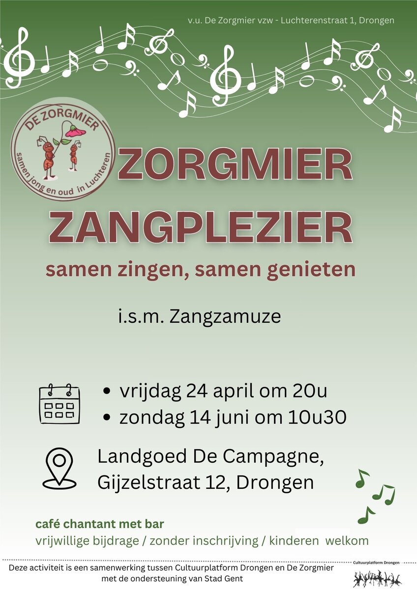 Iedereen is welkom op dit gezellige café chantant van vzw De Zorgmier in landgoed De Campagne. Jong en oud zingen samen bekende liedjes van vroeger en nu. Inschrijven is niet nodig en je hoeft niet eens te kunnen zingen. Iedereen kan meedoen en het is gratis !
